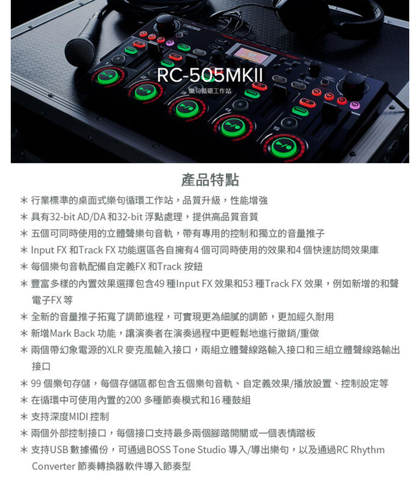 ◌ 提供USB資料備份功能,可運用BOSS Tone Studio匯入/匯出樂句,以及使用RC Rhythm Converter節奏轉換器軟體匯入節奏樂段