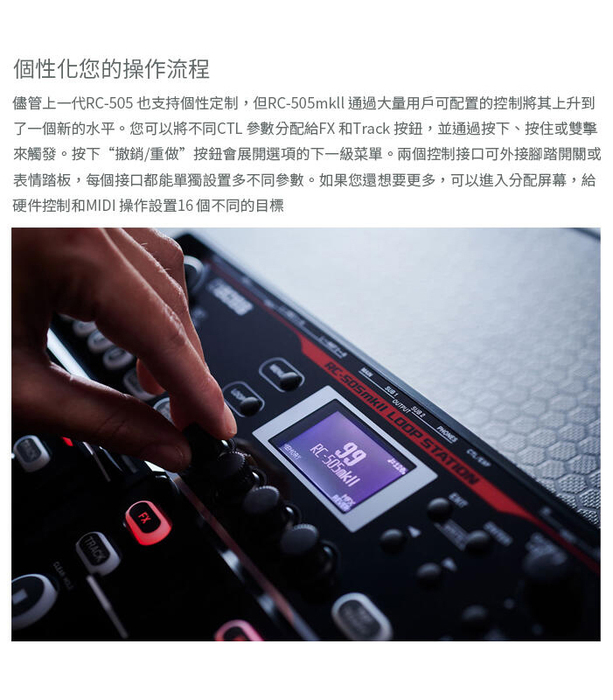 ◌ 99個內存記憶,每個記憶包含五個樂句音軌、自訂效果器和播放設定、控制功能配置設定等