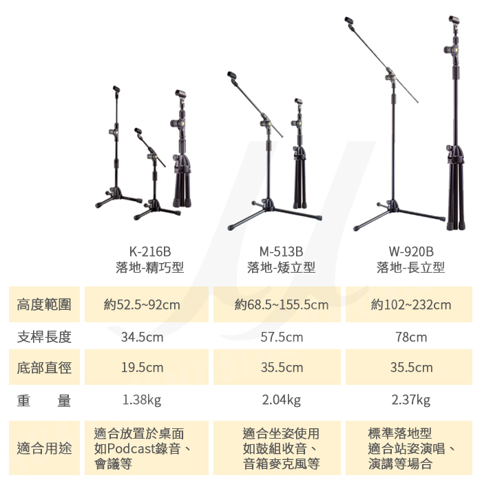 ◌ W920B 長立型 : 高度約102cm~232cm (附麥克風夾頭)