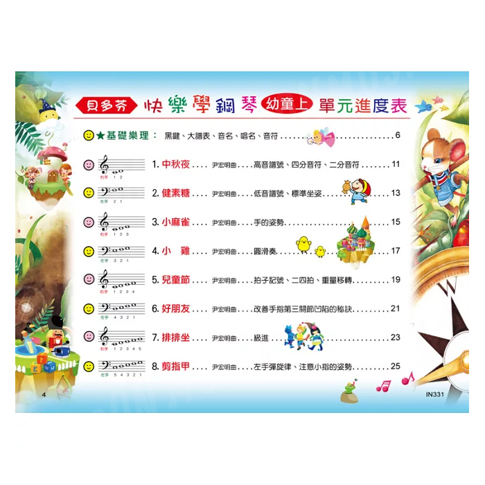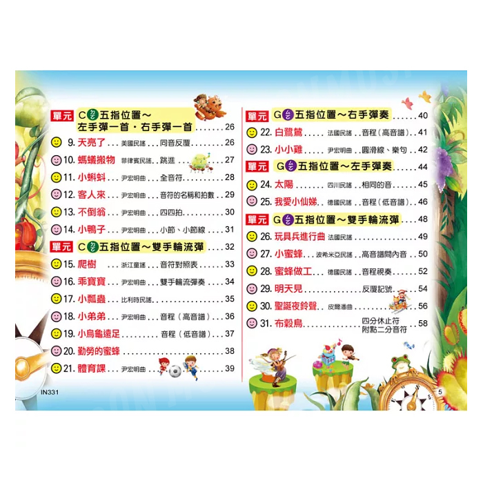 ◌ 將這些曲子放在五指位置上,這樣一來,孩子就更容易學習,也能在愉快的彈唱中享受到音樂的喜悅。