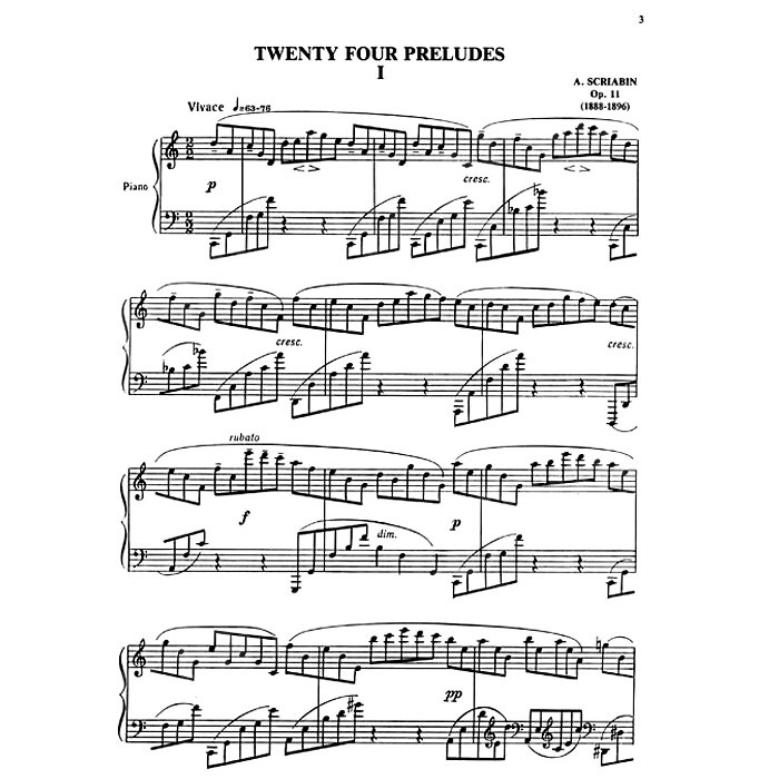史克里亞賓早期作品受到蕭邦的影響,後期將哲學和宗敎思想融入音樂中,音樂作品被標上了神秘主義,奏鳴曲從最早浪漫類似蕭邦風格,到具有獨特的節奏變化,不尋常的彈奏指示與和絃結構,呈現作曲者不同時期音樂面貌。「Preludes」15首鋼琴前奏曲集