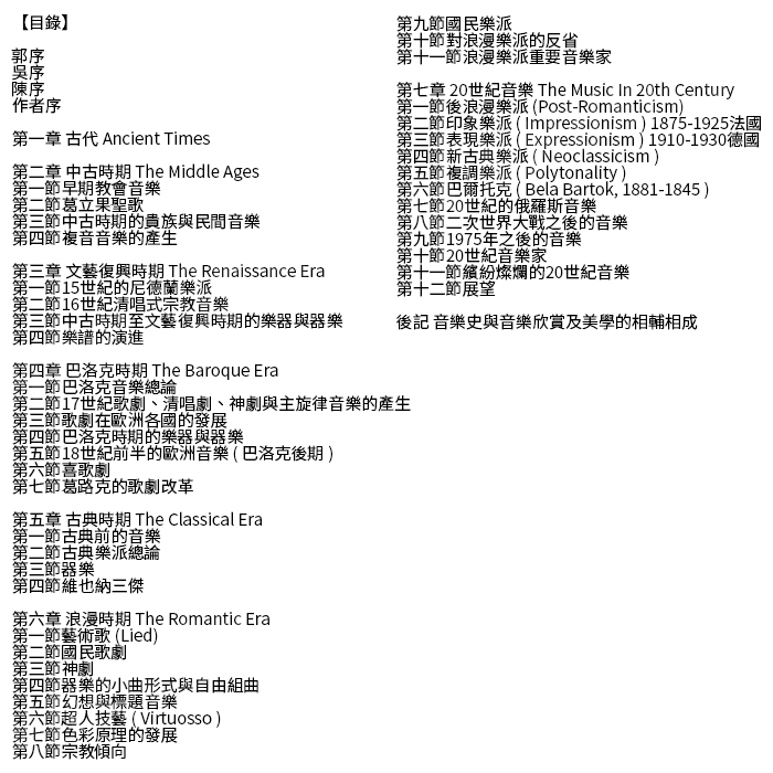 本書以「簡明」爲原則,擷取重要事項敘述,讓初涉西洋音樂史的學員,容易把握重點,通盤瞭解整個西洋音樂史的大綱。讀完本書之後,再按個別的需要,深入研究所需的部分