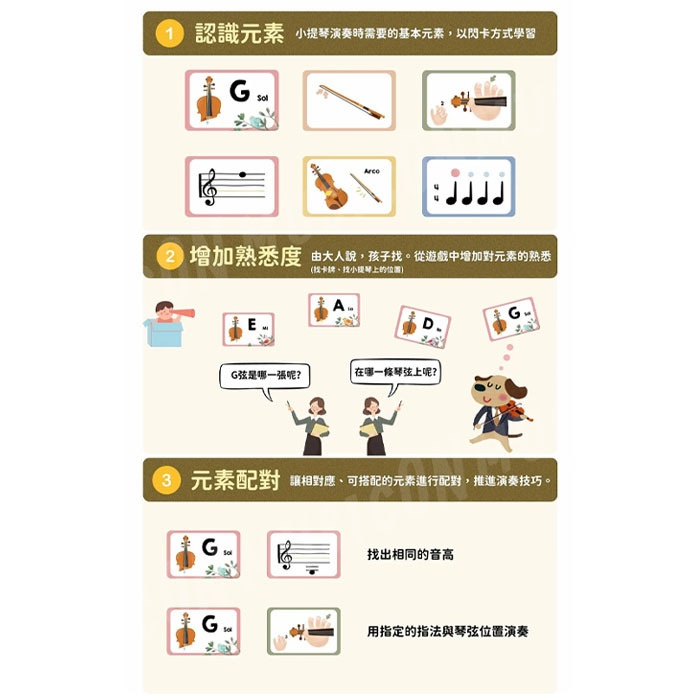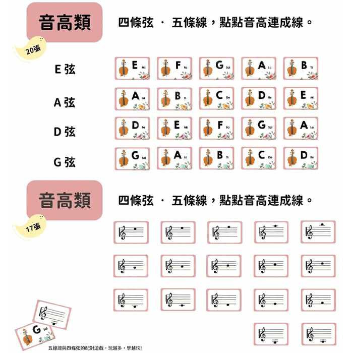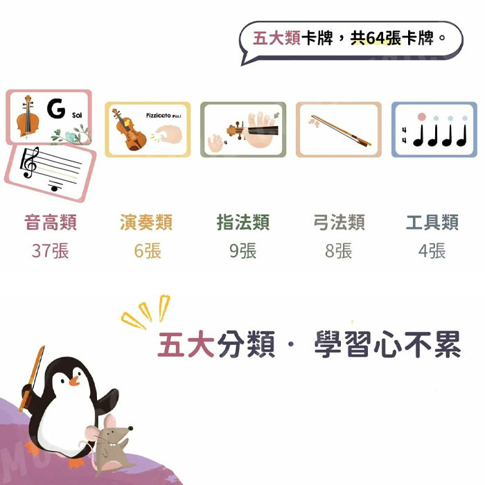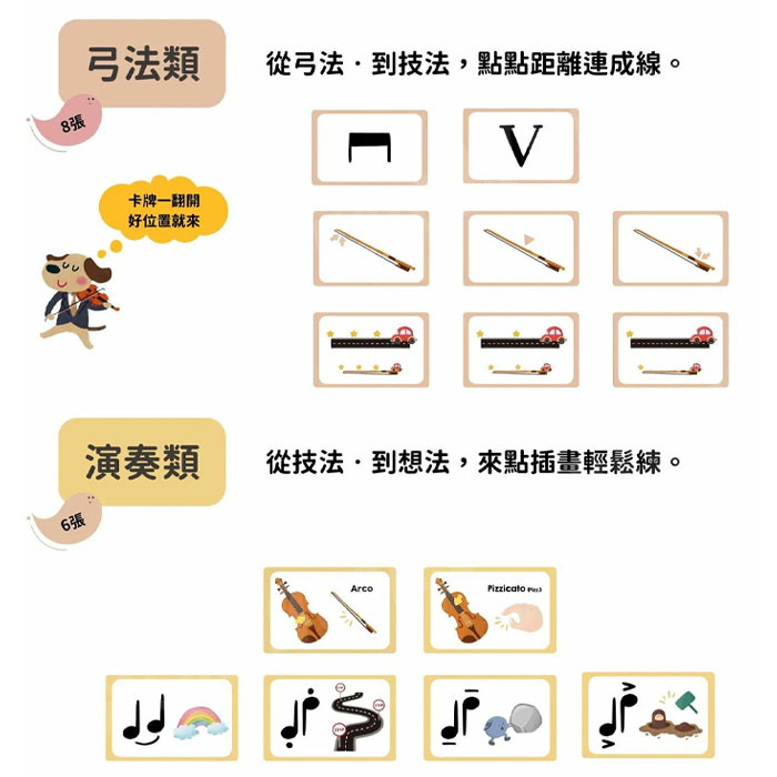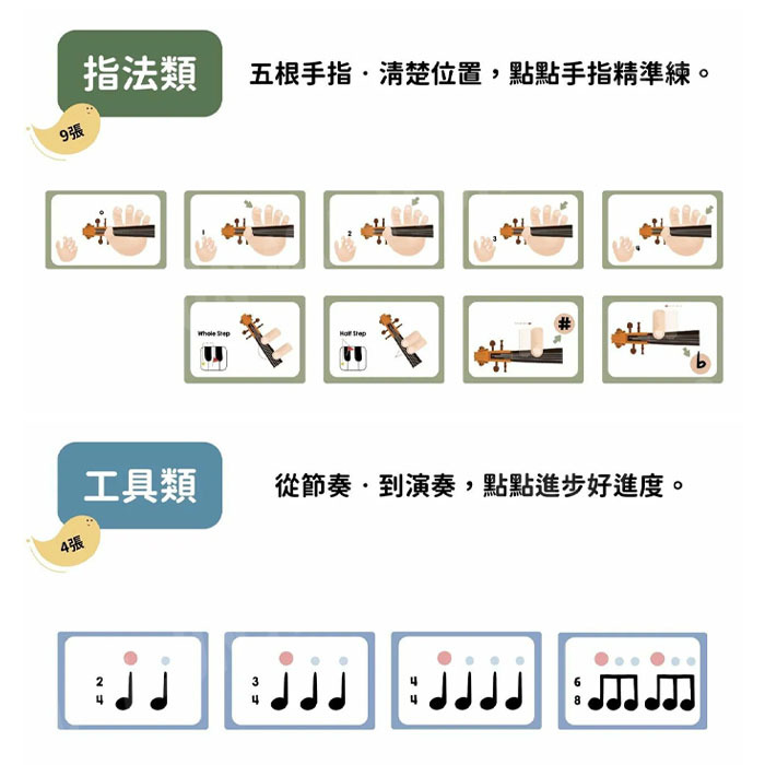 這款專為小提琴初學者設計的學習卡牌,涵蓋 5 大學習要素,透過生動的圖像與靈活的玩法,幫助學生快速熟悉指法、弓法與音名位置,在輕鬆的遊戲中建立音樂基礎