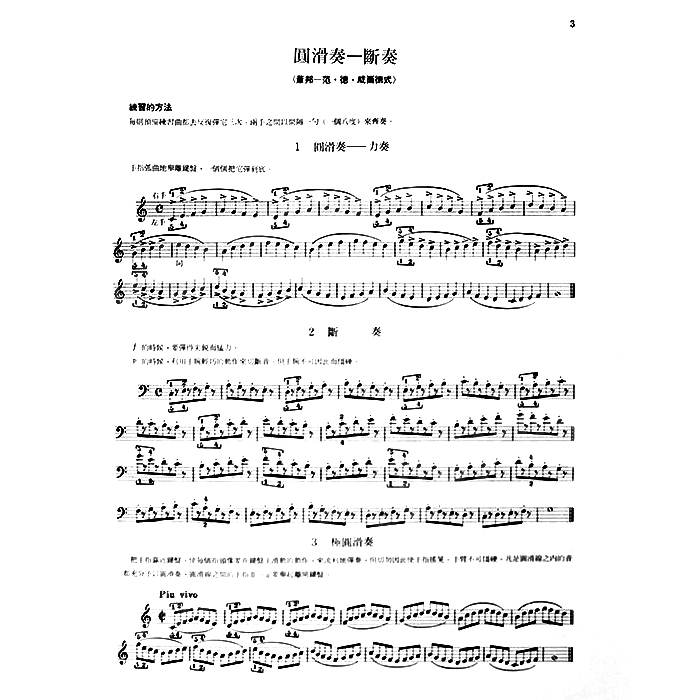 全書鋼琴技巧課程依「蕭邦體系」編纂而成,著重在「斷奏」和「圓滑奏」的彈法上,訓練排除手的重量、加強手指力度均等以及左右手靈活度,培養鋼琴演奏技法和音樂詮釋上兼具柔軟性、圓滑性與優美性
