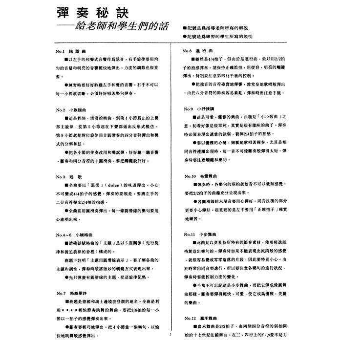 選錄巴洛克、羅可可時代爲大鍵琴、古鋼琴或翼琴等樂器譜寫的作品。蒐集的幾乎都是由二聲部構成的樂曲。我們熱切盼望學琴者確實學習「複音音樂」,廣泛地彈奏古典樂派、浪漫樂派、近代與現代樂曲的可能性大大地增加