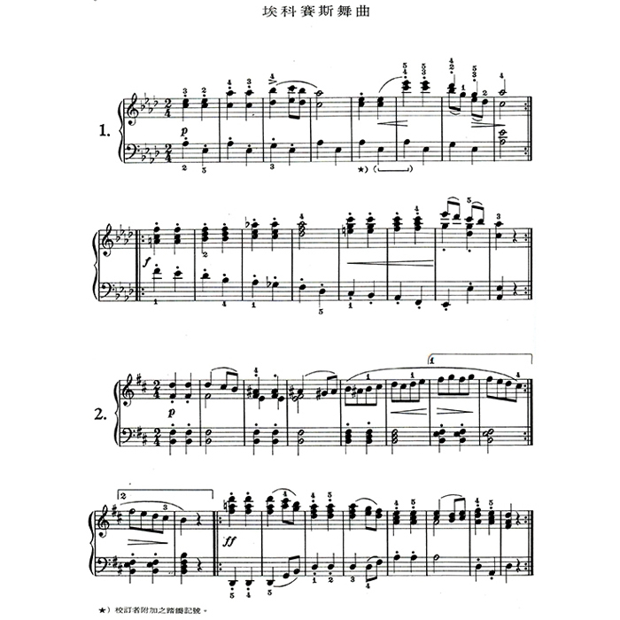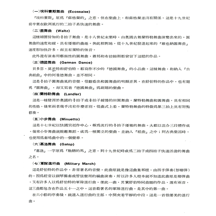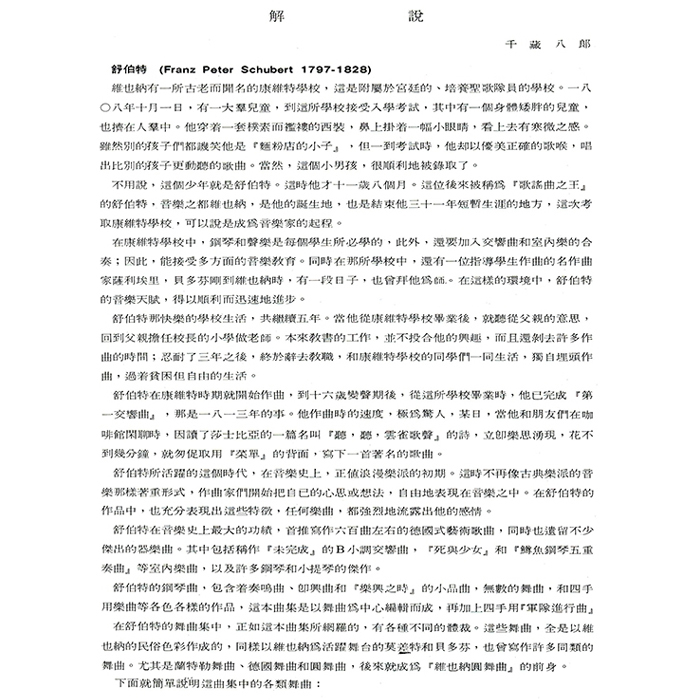 從舒伯特眾多鋼琴獨奏曲的舞曲作品中,選出較容易的小曲以供初階學生彈奏。在譜面上的各首樂曲,雖然只有兩拍子或三拍子的單調伴奏節奏,但這些樂曲都以優美的曲調,表達出不同情韻。約徹爾尼30曲(作品八四九)程度,可與小奏鳴曲集搭配學習使用