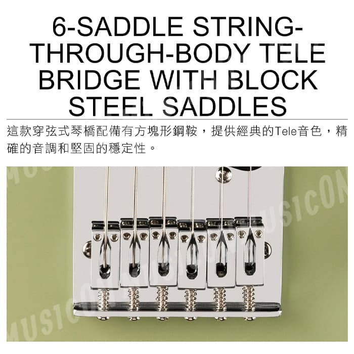 ◌ 6鞍座穿弦式Tele琴橋,配有方塊形鋼鞍