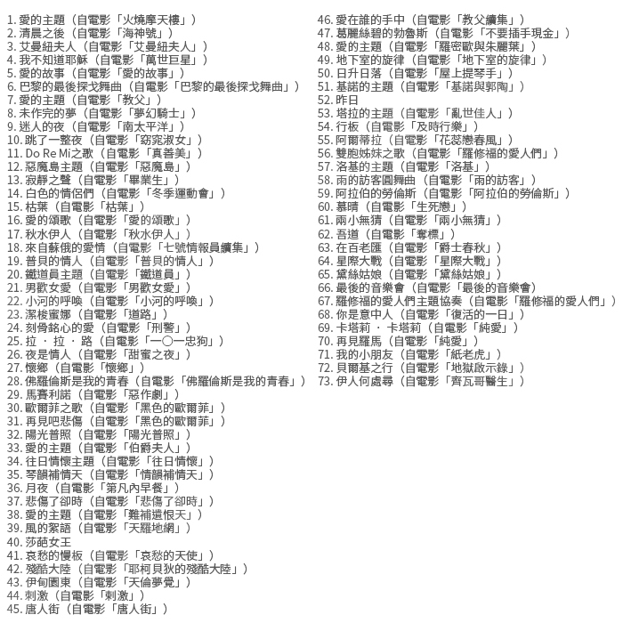 鋼琴電影名曲集 教父 窈窕淑女 羅密歐與朱麗葉 似曾相識 大白鯊 外星人 洛基 粉紅豹 1