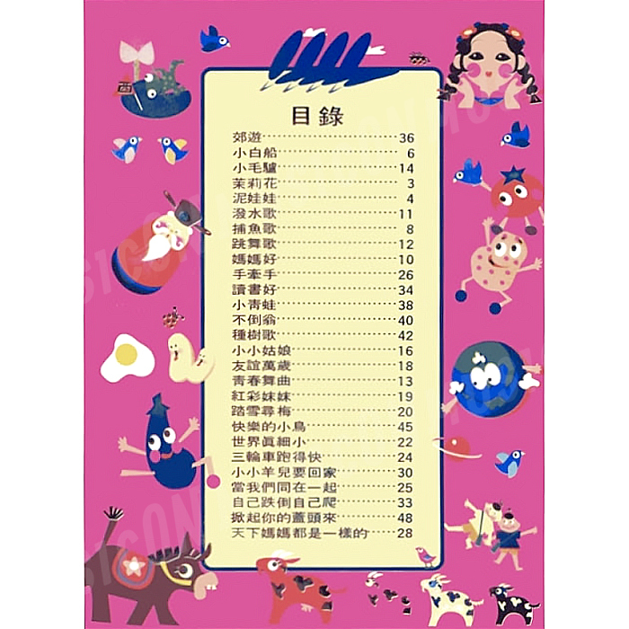 ◌ 曲目 : 郊遊 / 小白船 / 茉莉花 / 泥娃娃 / 潑水歌 / 捕魚歌 / 跳舞歌 / 媽媽好 / 手牽手 / 讀書好 / 小青蛙 / 不倒翁 / 重樹歌 / 小小姑娘 / 友誼萬歲 / 紅彩妹妹 / 踏雪尋梅 / 快樂的小鳥 / 世界真細小 / 三輪車跑得快 / 小小羊兒要回家 / 當我們同在一起 / 自己跌倒自己爬 / 掀起你的蓋頭來 / 天下的媽媽都是一樣的