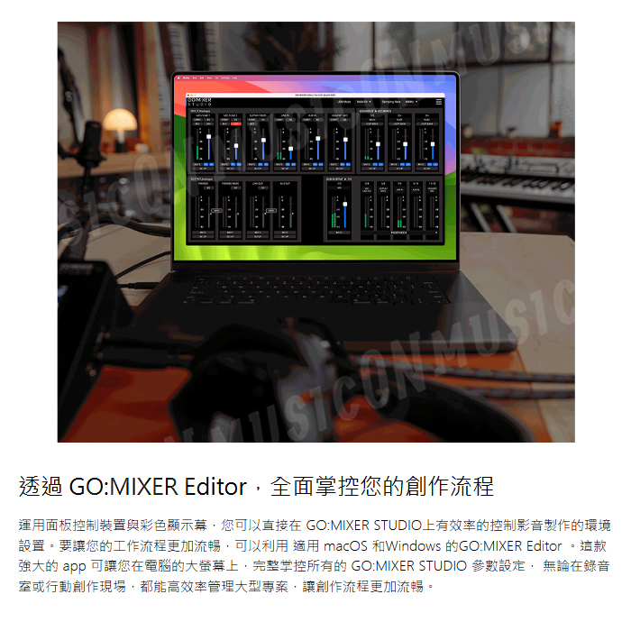 ◌ GO:MIXER Editor for macOS和Windows,可在電腦螢幕上即時控制GO:MIXER STUDIO功能