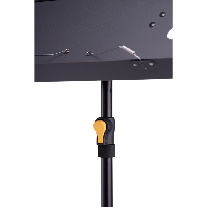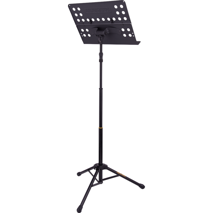 HERCULES 三節式樂譜架 BS418BPLUS 配備 EZ Grip 高度調整裝置、可折疊穿孔桌面、可折疊三腳架底座和金屬絲樂譜夾。隨附 H 型夾。