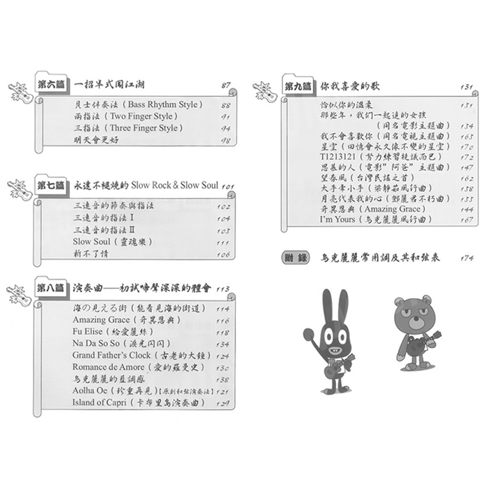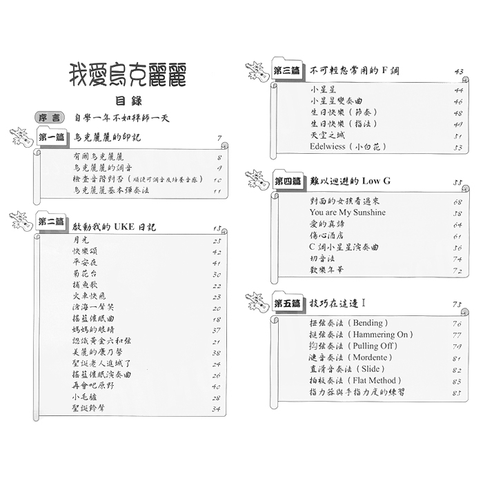 編者以初學者對烏克麗麗的印記,慢慢的啟動對烏克麗麗的印記,再配合音階與和弦的律動,在彈奏的韻律中,烏克麗麗終於成為您手中可恣意把玩,可一招半式闖江湖的樂器。