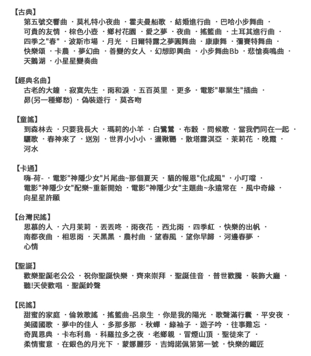 聖誕歌曲譜8首;童謠曲譜16首;台灣民謠曲譜15首;